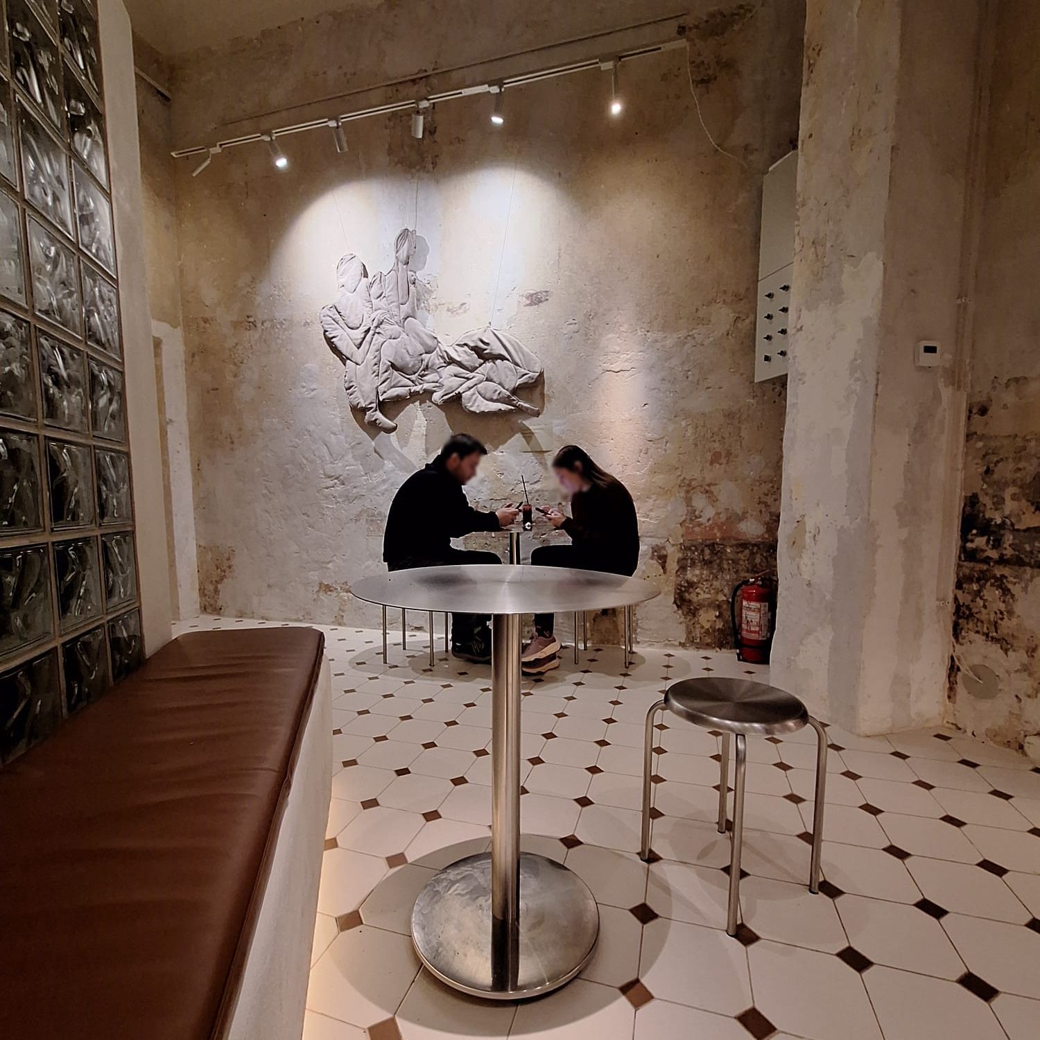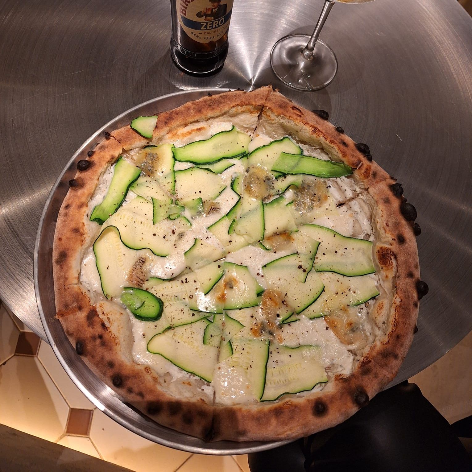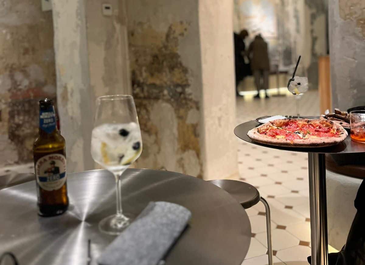 Când ai asociat ultima oară pizza cu cocktail? Sună cunoscut? Deloc. Și totuși, funcționează. Nu e frig, e doar o răcoare plăcută, venită din pereții neterminați, frescele din cârpă și simbolismul discret cu Fecioara Maria. Locul respiră intenționat neterminat. Personal tânăr, bucătărie la vedere — genul de transparență care te liniștește.