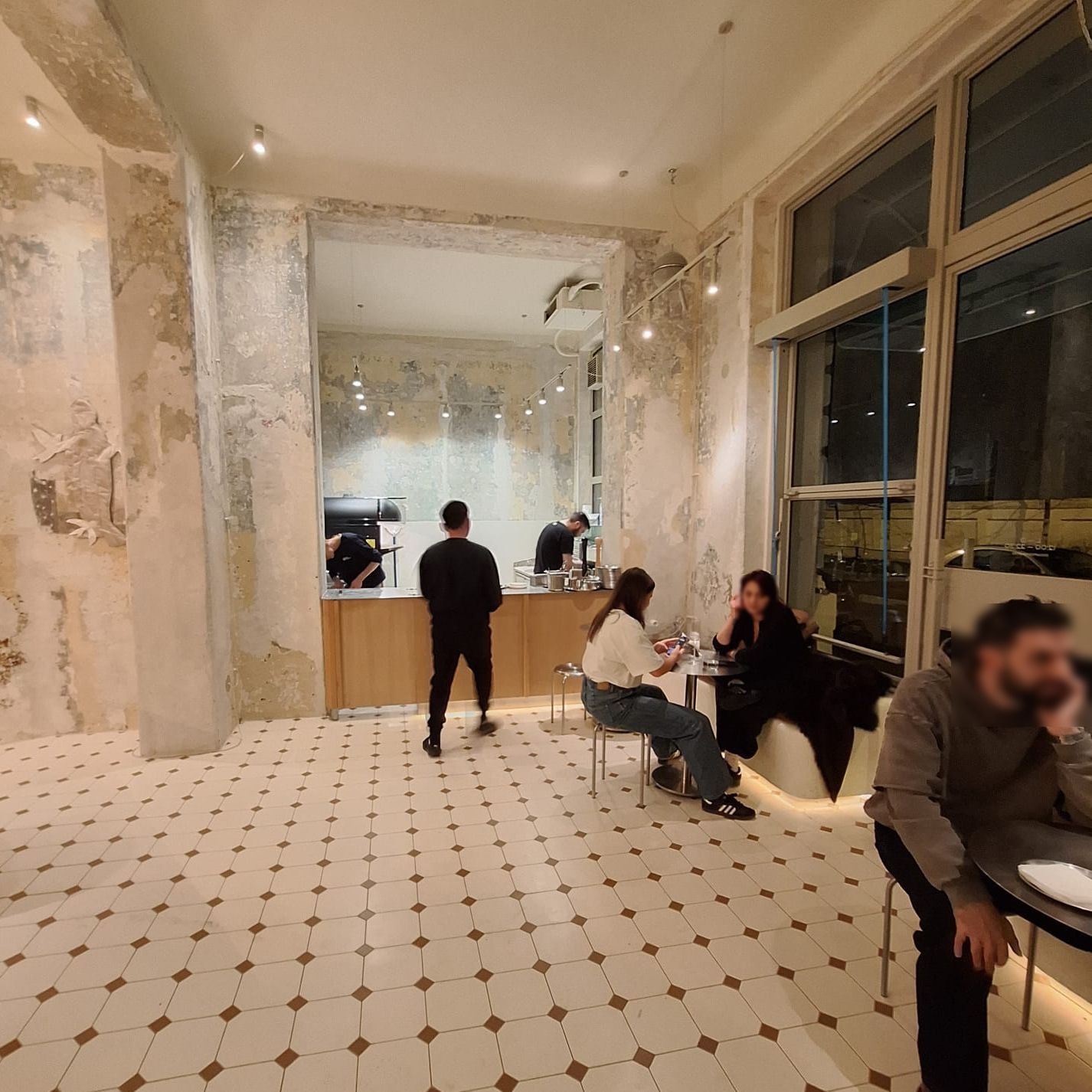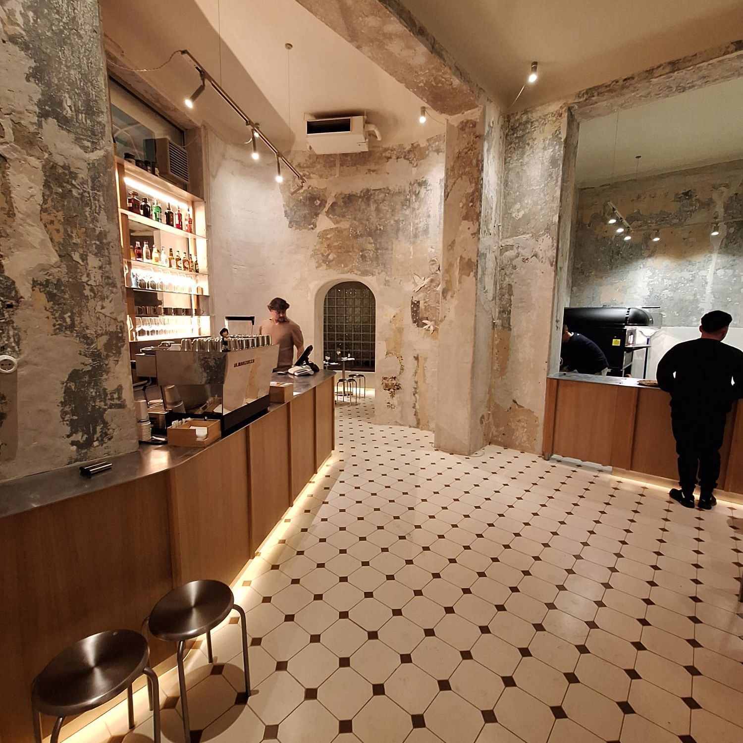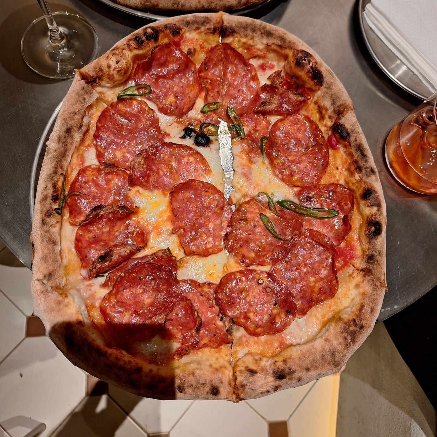 Când ai asociat ultima oară pizza cu cocktail? Sună cunoscut? Deloc. Și totuși, funcționează. Nu e frig, e doar o răcoare plăcută, venită din pereții neterminați, frescele din cârpă și simbolismul discret cu Fecioara Maria. Locul respiră intenționat neterminat. Personal tânăr, bucătărie la vedere — genul de transparență care te liniștește.