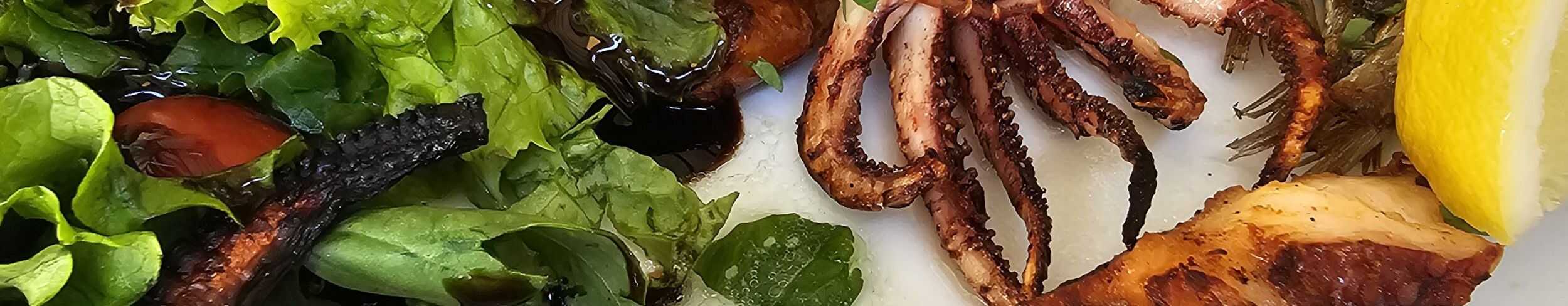 Am share-uit cu Radu un biban de mare la grătar și un calamar umplut cu feta (nu la fel de bun ca cel mâncat în Santorini).